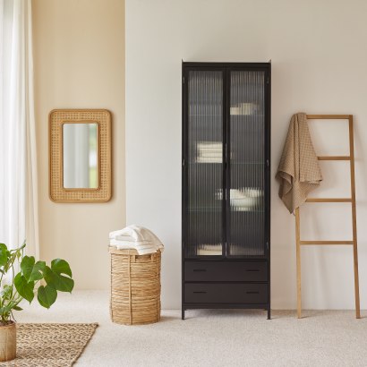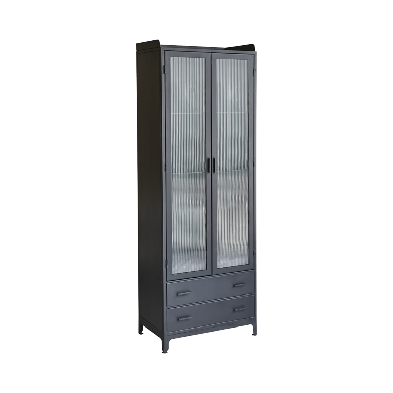 2 puertas acristaladas tras las que se encuentran 4 espacios de almacenaje: