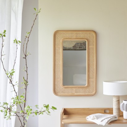 Espejo de teca maciza y mimbre de 90 cm x 60 cm