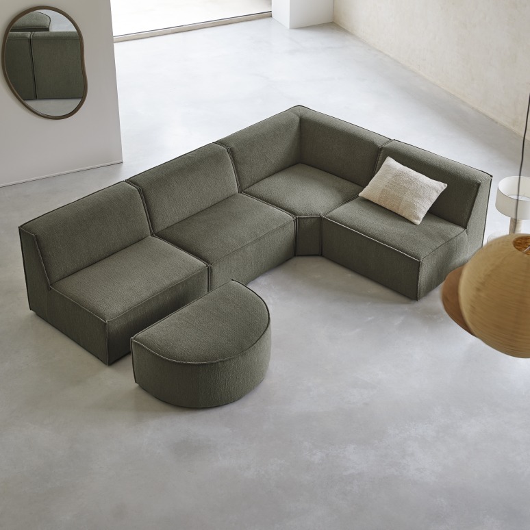 Sofá esquinero modular en tela verde, 5-6 plazas