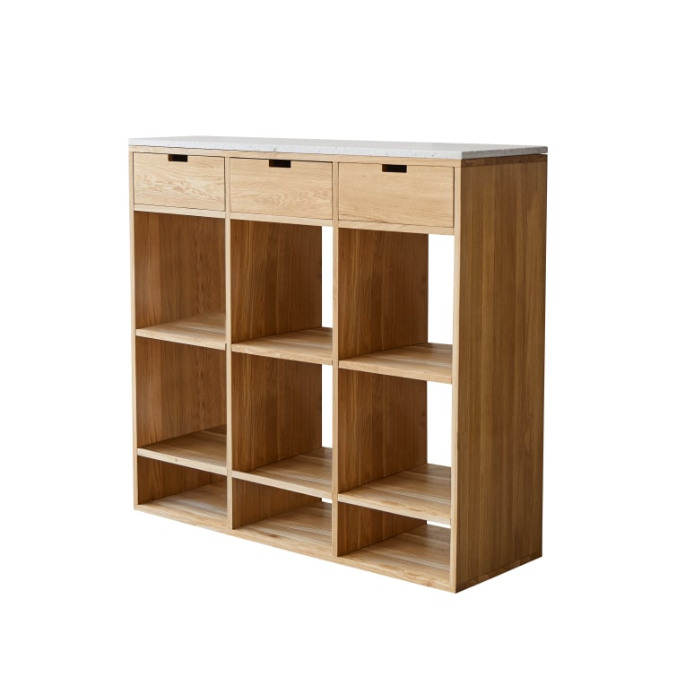 Biblioteca baja de roble macizo y terrazo prémium blanco
