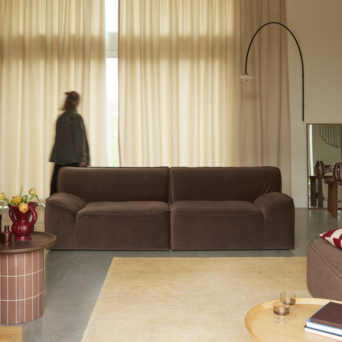 Sofá modular de 2 plazas con reposabrazos en tejido marrón