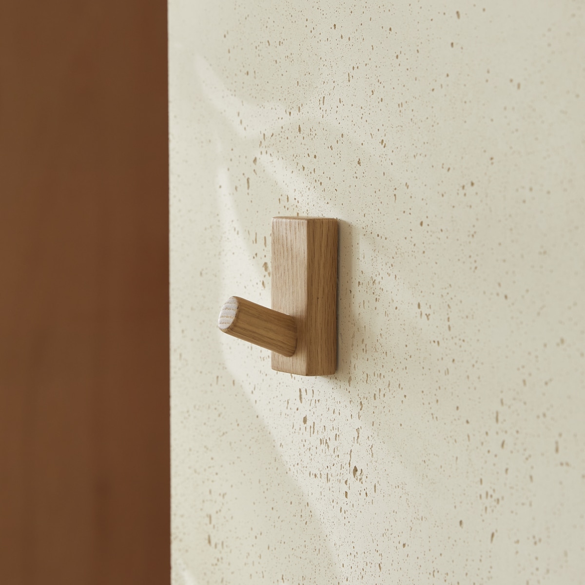 La percha de roble Sara también está disponible de fresno teñida, terrazo crema,  terrazo negro y hormigón gris, así como terrazo confeti.